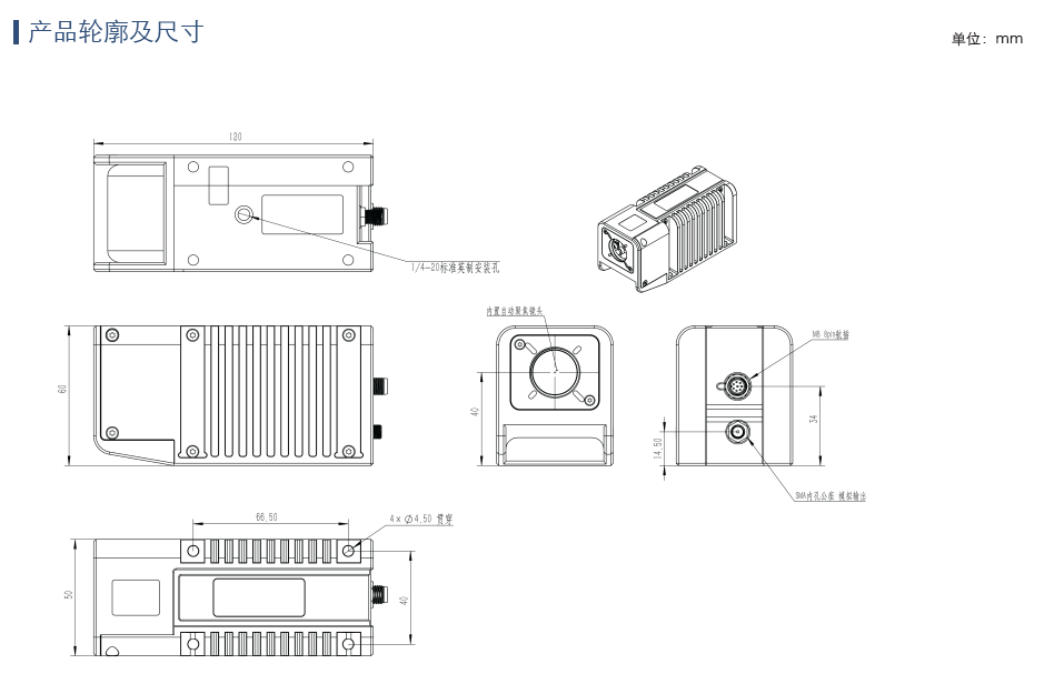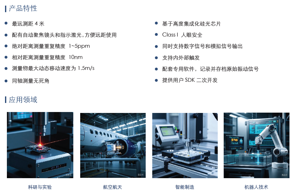• 最远测距 4 米 • 配有自动聚焦镜头和指示激光,方便远距使用 • 绝对距离测量重复精度 1~5ppm • 相对距离测量重复精度 10nm • 测量物最大动态移动速度为 1.5m/s • 同轴测量无死角 • 基于高度集成化硅光芯片 • 同时支持数字信号和模拟信号输出 • 支持内外部触发 • 配套专用软件,记录并存档原始振动信号 • 提供用户 SDK 二次开发