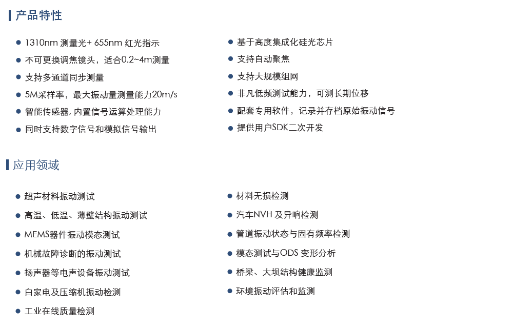 • 基于高度集成化硅光芯片 • 非接触式测量 • 支持多通道同步测量 • 最大振动量测量能力 20m/s • 同时支持数字和模拟信号输出 • 智能传感器, 内置信号运算处理能力 • 5M采样率 • 1310nm 测量光、655nm 红光指示 • 提供用户SDK二次开发 • 非凡低频测试能力,可测长期位移 • 支持大规模组网