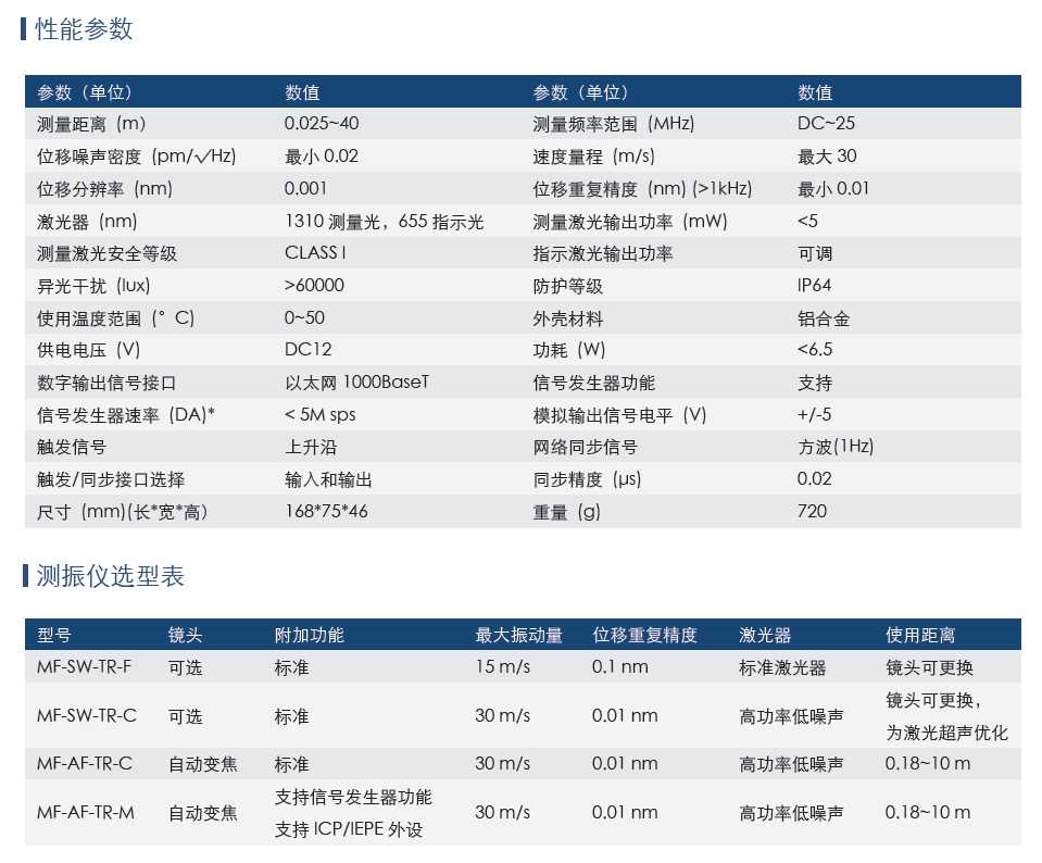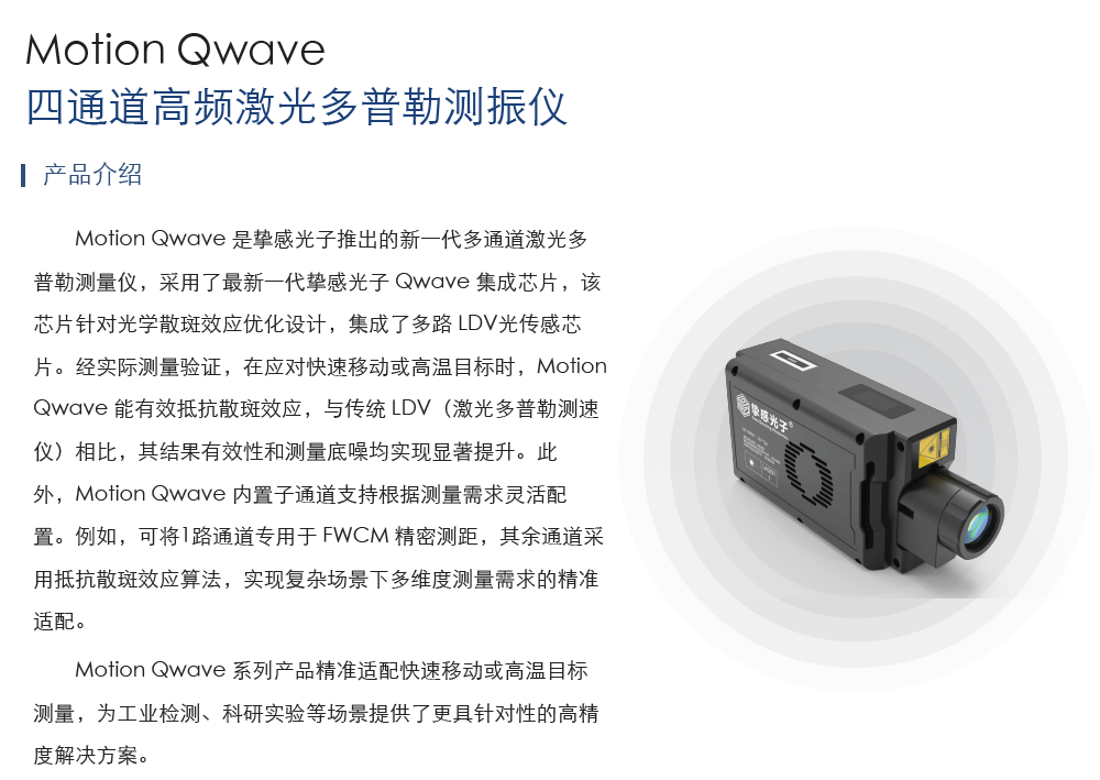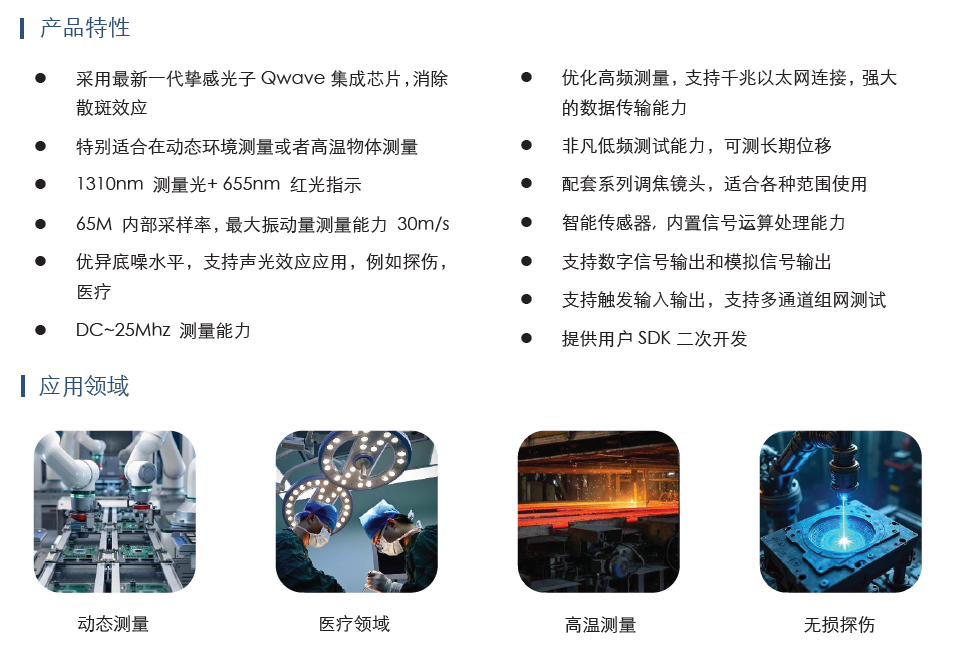 • 采用最新一代挚感光子 Qwave 集成芯片,消除散斑效应 • 特别适合在动态环境测量或者高温物体测量 • 1310nm 测量光+ 655nm 红光指示 • 65M 内部采样率,最大振动量测量能力 30m/s • 优异底噪水平,支持声光效应应用 • DC~25Mhz 测量能力 • 优化高频测量,支持千兆以太网连接 • 非凡低频测试能力,可测长期位移 • 配套系列调焦镜头,适合各种范围使用 • 智能传感器, 内置信号运算处理能力 • 支持数字和模拟信号输出 • 支持触发输入输出,支持多通道组网测试 • 提供用户 SDK 二次开发